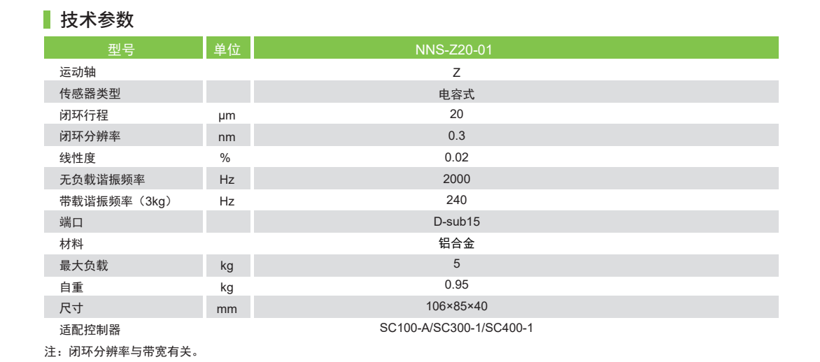 NNS-Z20-01是一款Z軸方向的運動臺,閉環(huán)行程20μm,可提供0.3nm的閉環(huán)分辨率。具有大負載,高諧振頻率,高帶寬的特性。采用表面陽極氧化黑工藝,滿足光學類應用??捎糜趥葤焓綉?。